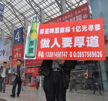 今年,成都春季全国糖酒会依然是人气超高,会上人声鼎沸,摩肩接踵。一位手举广告牌的突然吸引了周围人的注意,只因这个广告牌上的文字十分扯眼球,写着“厚道啤酒商标 1亿元寻爹”,下面还留有手机和QQ的联系方式。