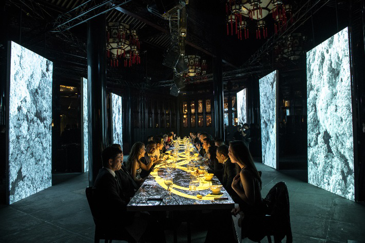 秉承锐意创新的酒庄精神,唐培里侬邀请意大利著名艺术家Marco Foltran在晚宴中别出心裁地以餐桌为画布,通过高科技手段,改变晚宴的空间氛围和视觉体验,营造浸入式场景。晚宴从视觉、听觉、嗅觉及味觉全方位揭开唐培里侬年份香槟丰富的韵味和动人韵律。细腻饱满的品味过程,惟妙诠释唐培里侬香槟繁复且惊艳的世界。