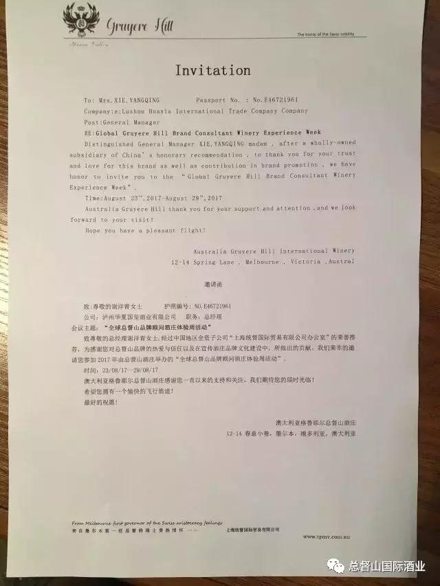 2017年8月18日,澳大利亚格鲁耶尔总督山国际酒庄中国地区执行董事谢佳强先生对收到总督山国际酒庄特别邀请的三位同事表示热烈的祝贺,同时颁发了邀请函并致辞,表扬了三位同事在工作中兢兢业业,任劳任怨,才获得了总督山酒庄的认可和肯定,同时也希望她们能够在此次培训会中认真学习,在丰富自身葡萄酒文化知识的同时提高公司的文化形象。