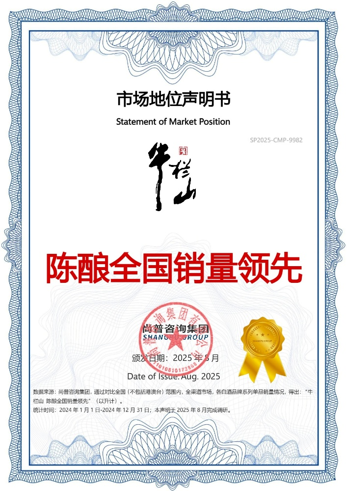 2025年8月,尚普咨询集团为牛栏山颁发市场地位声明书。此次牛栏山荣获尚普咨询【牛栏山陈酿10年累计销售60亿瓶】【牛栏山陈酿全国销量第一】【牛栏山陈酿全国销量遥遥领先】【牛栏山陈酿全国销量领先】市场地位声明,标志着牛栏山在光瓶酒赛道的领导地位及市场的高度认可。