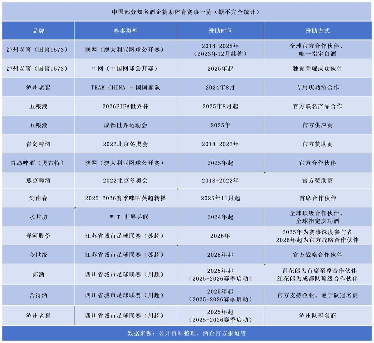 据《每日经济新闻·将进酒》记者不完全统计,仅2024年~2026年,就有五粮液、剑南春、洋河股份、青岛啤酒等十余家酒企赞助多个知名体育赛事。